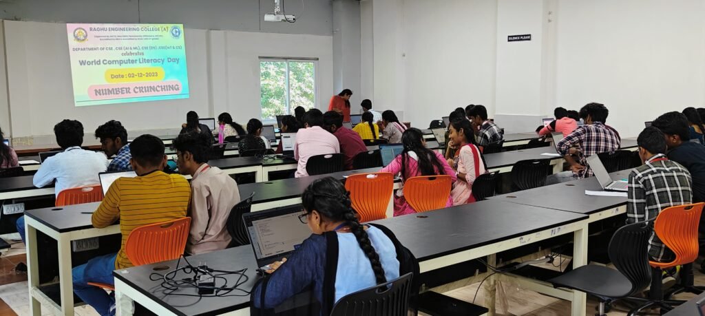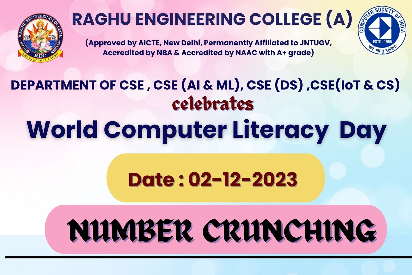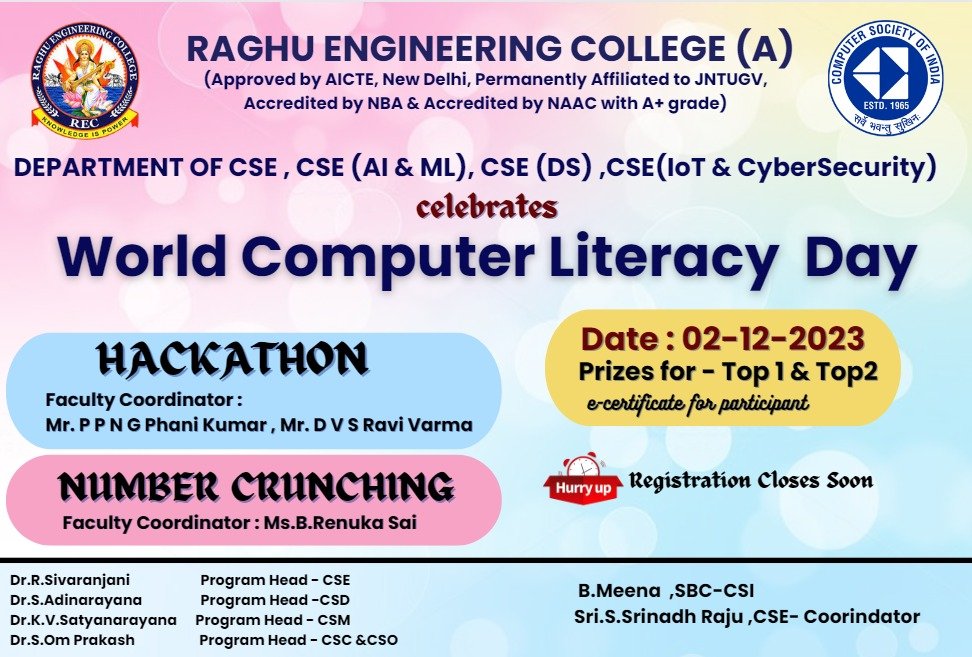 The Department of CSE ,CSE (AI & ML), CSE (DS),CSE (CS & IoT) is celebrating World Computer Literacy Day on 2nd December 2023 by conducting Hackathon - Coding Contest & Number Crunching (Aptitude & Reasoning Contest) for II Year Students in association with CSI , Visakhapatnam , Region V.